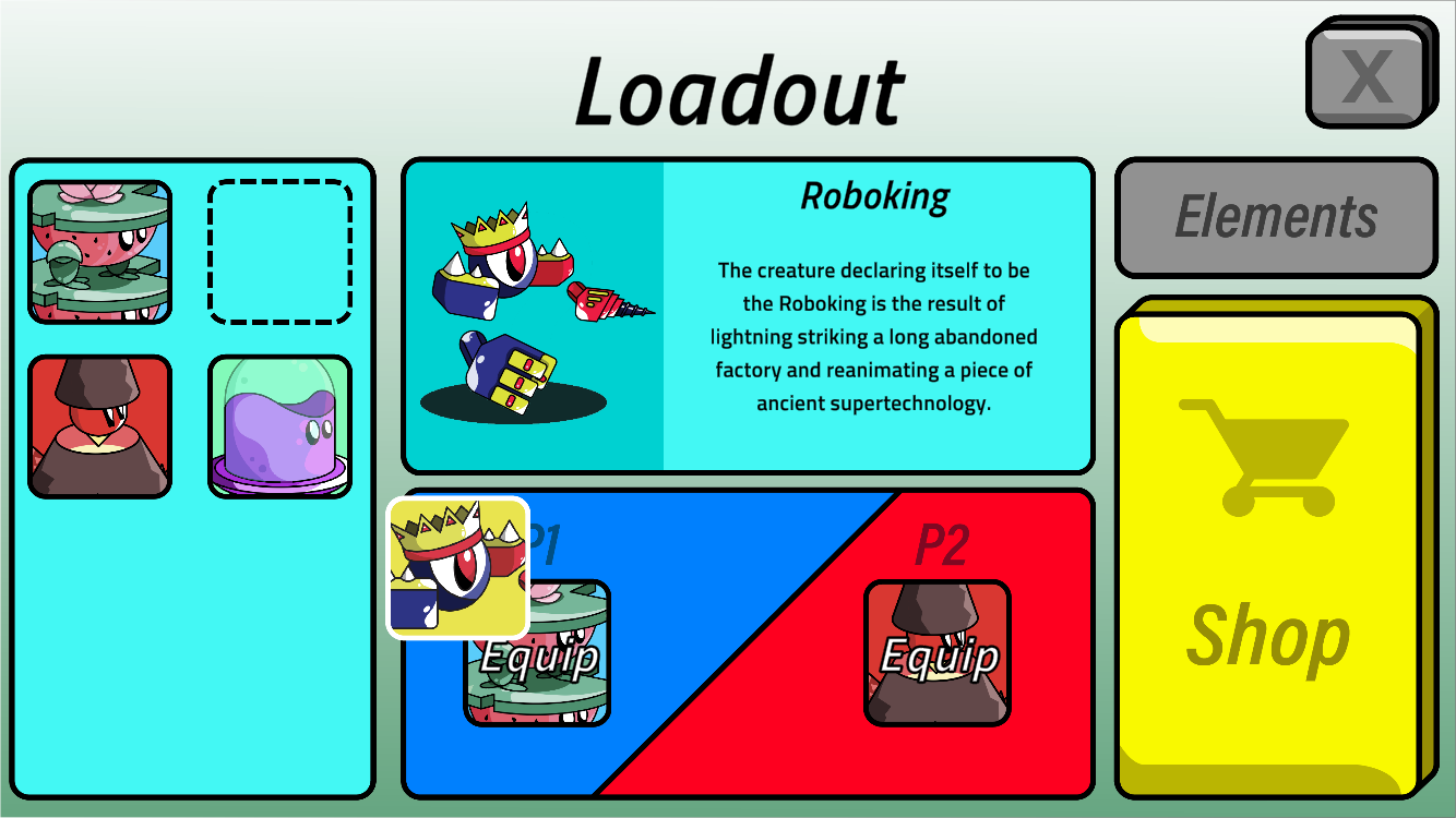 The character select screen includes a character roster that can be dragged and dropped into slots for 2 players. Selecting a character prompts a pop up with a short description. Players can also access the shop from this screen in order to unlock new characters and other content (not currently available).