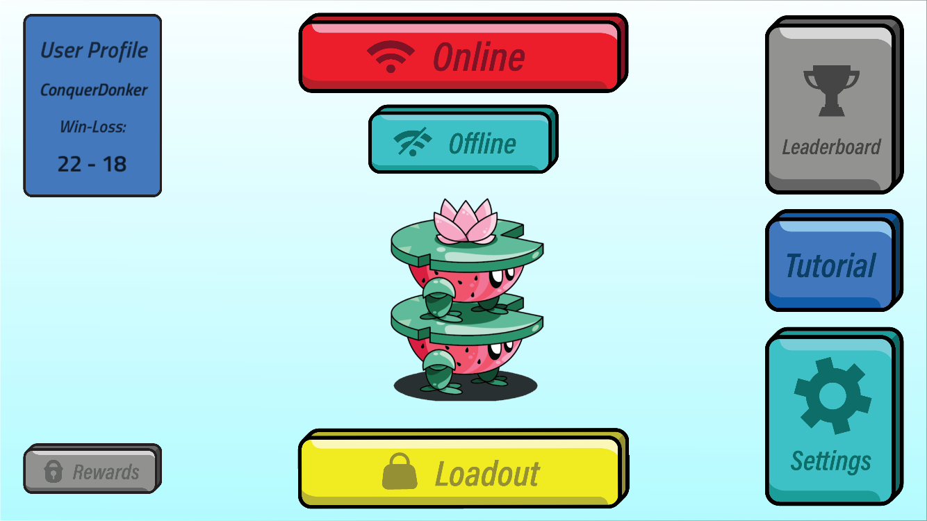 Since our game's main feature is the ability to play online, the online button is at the top center of the screen and colored red to grab players' attention. The middle of the screen features the current selected character for online play, right above the loadout button that takes the player to the character select screen.
